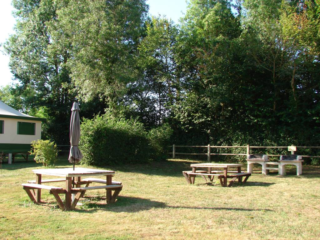 Barbecue collectif et tables mis à disposition ( kit feu en vente à la réception)