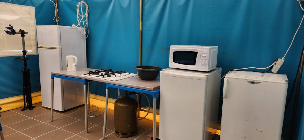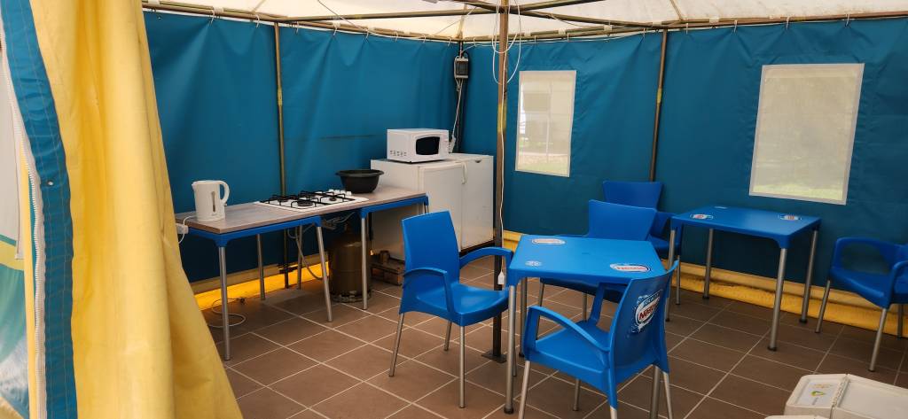 Une grande toile aménagée en cuisine avec tables, chaises, réfrigérateurs, congélateur, plaque de cuisson, micro-onde, bouilloire vous est dédiée.