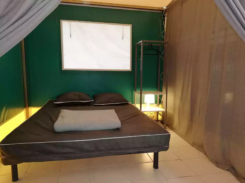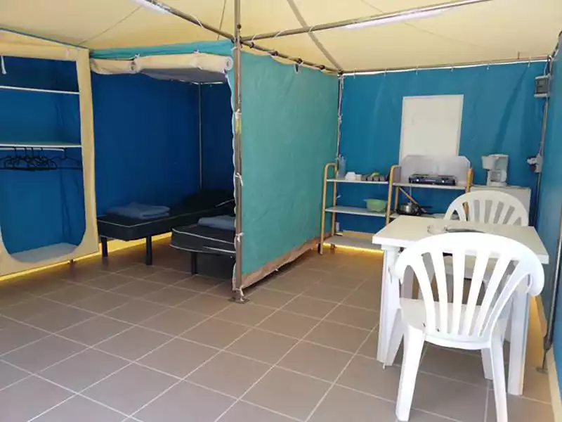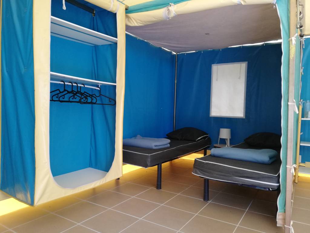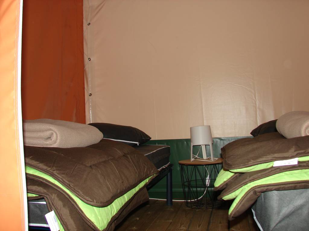 Tente prêt à camper avec literies, aménagement simple pour dormir au sec et confortablement tout en respectant l'esprit du camping authentique.
