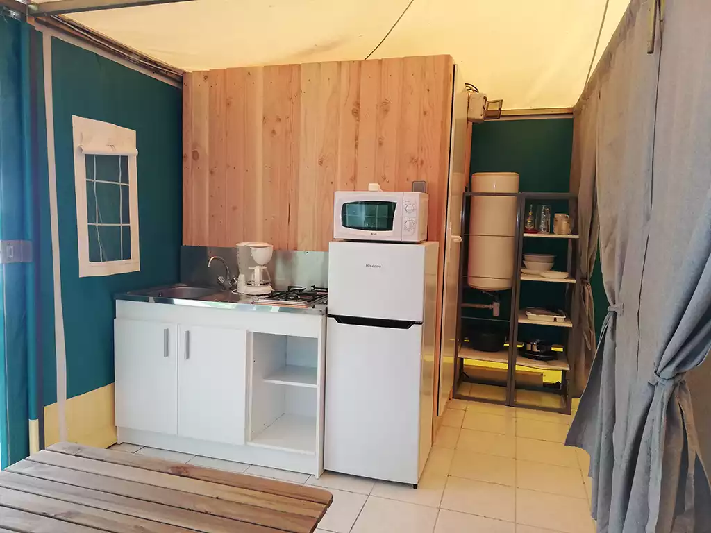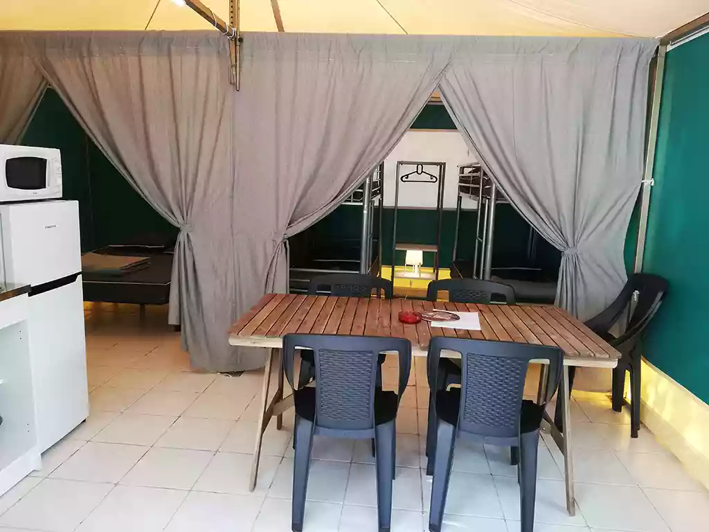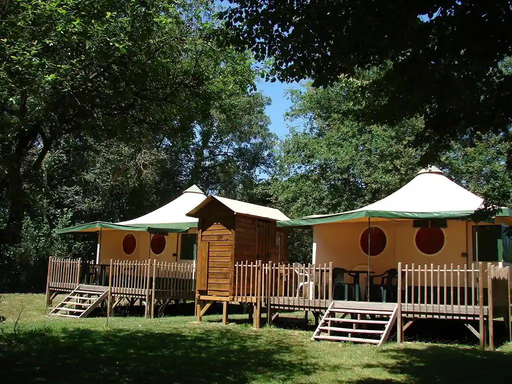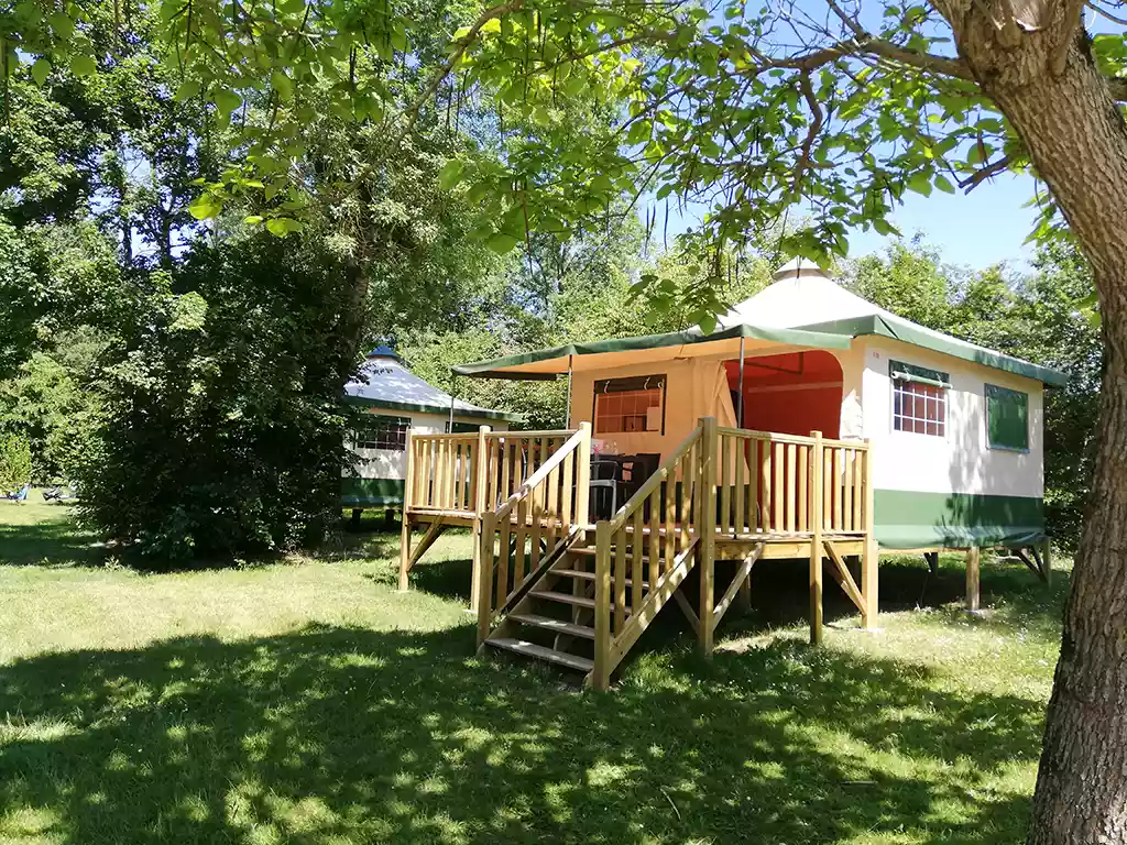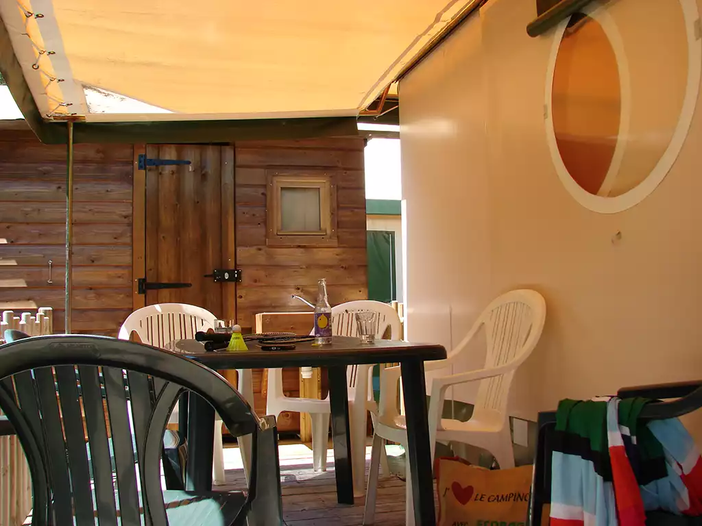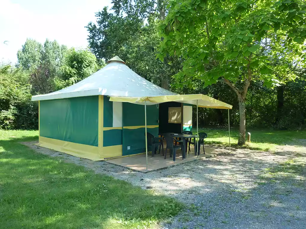 Tente aménagée pour plus de confort tout en respectant l'esprit du camping authentique. Idéale pour la famille.