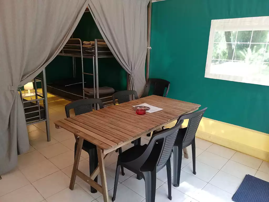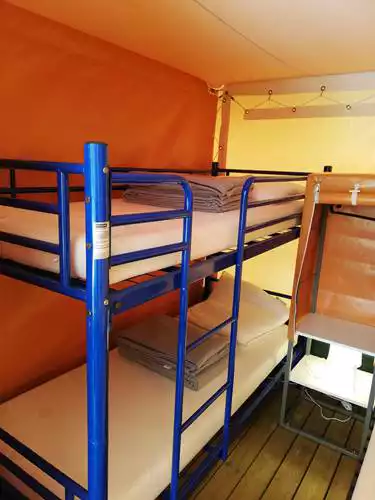 Tente aménagée de literies pour dormir au sec avec sérénité tout en respectant l'esprit du camping authentique. Idéale pour une nuit de passage.