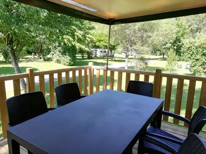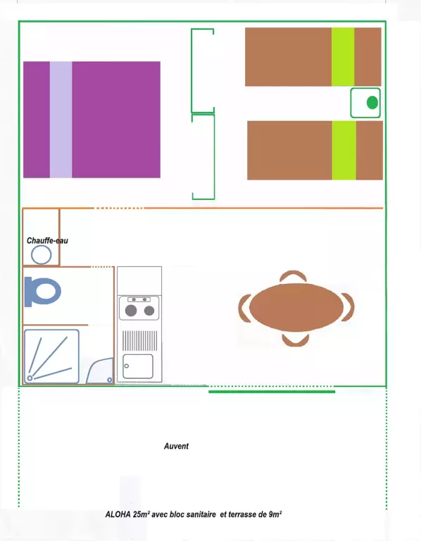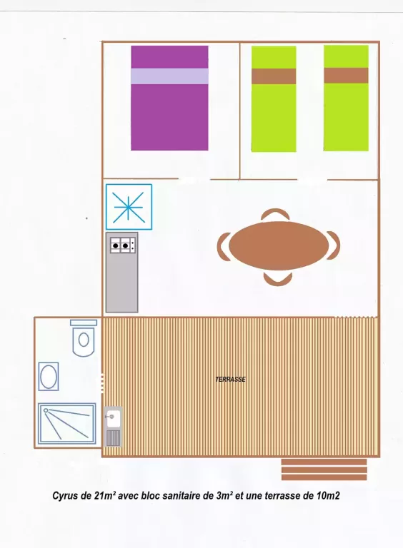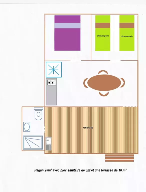 Toilé PAGAN de 35m² avec bloc sanitaire, une terrasse couverte de 10m² pour 5/6 personnes avec 2 chambres.