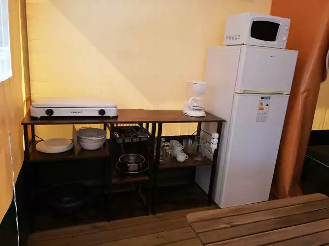 - 1 kitchenette avec 1 frigo table top, 1 plaque de cuisson, 1 cafetière électrique et de la vaisselle