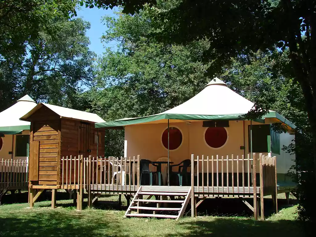 Tente aménagée avec un bloc sanitaire pour un grand confort tout en respectant l'esprit du camping authentique. Idéale pour la famille.